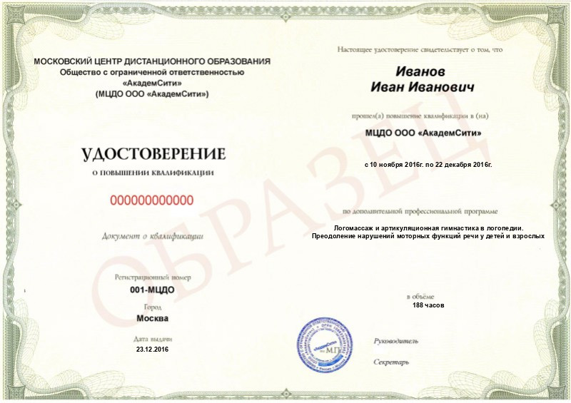 Курс «Логомассаж и артикуляционная гимнастика в логопедии. Преодоление нарушений моторных функций речи у детей и взрослых» реализуется заочно с применением дистанционных образовательных технологий и продолжается 6 недель (188 часов).
